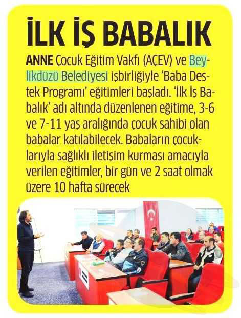 6 Kasım 2017 tarihli "STAR" gazetesi. Anne Çocuk Eğitimi Vakfı (AÇEV) ve Beylikdüzü Belediyesi işbirliğiyle "Baba Destek Programı" eğitimleri başladı.