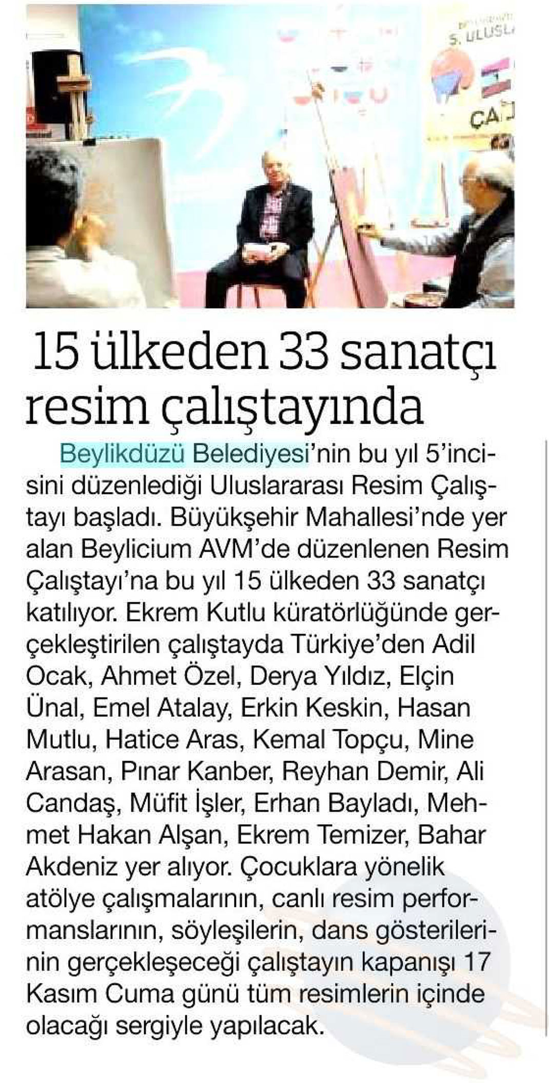 15 Kasım 2017 tarihli "HABERTÜRK" gazetesi. Beylikdüzü Belediyesi'nin bu yıl 5'incisini düzenlediği Uluslararası Resim Çalıştayı başladı.Büyükşehir Mahallesi'nde yer alan Beylicium AVM'de düzenlenen Resim Çalıştayı'na bu yıl 15 ülkeden 33 sanatçı katılıyor.