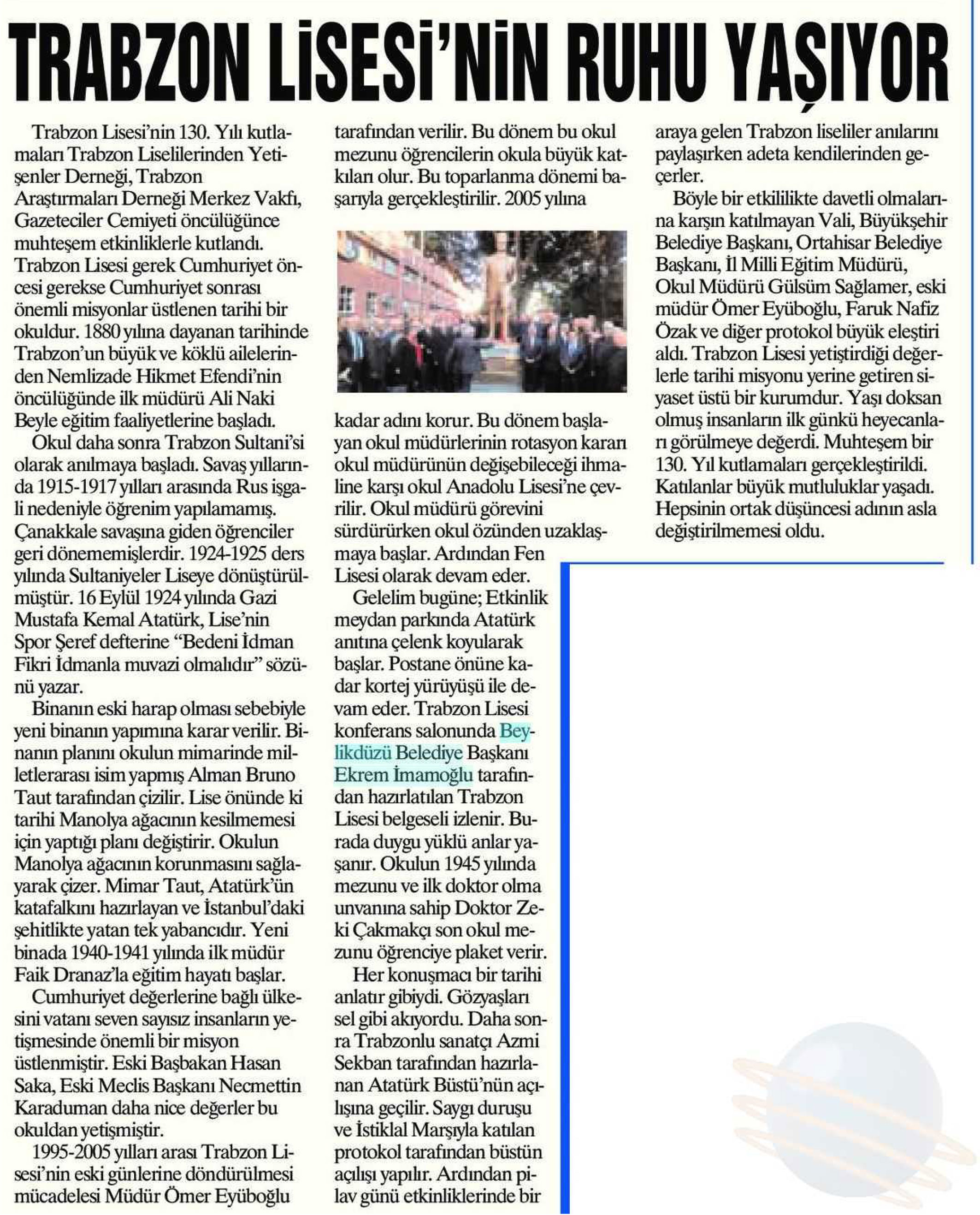15 Kasım 2017 tarihli "TAKA" gazetesi. Trabzon Lisesi'nin 130. Yılı kutlamaları Trabzon Liselilerinden Yetişenler Derneği, Trabzon Araştırmaları Derneği Merkez Vakfı, Gazeteciler Cemiyeti öncülüğünce muhteşem etkinliklerle kutlandı.
