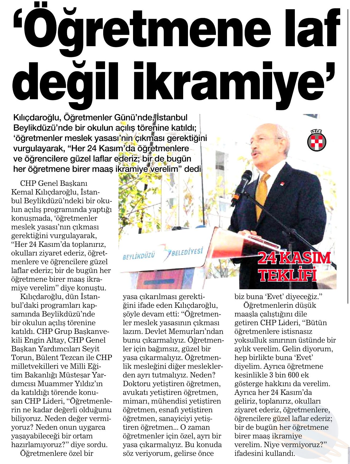 25 Kasım 2017 tarihli " HABERTURK" gazetesi. Kılıçdaroğlu Öğretmenler Günü'nde, İstanbul Beylikdüzü'nde bir okulun açılış törenine katıldı; 'öğretmenler meslek yasasının' çıkması gerektiğini vurgulayarak, "Her 24 Kasım'da öğretmenlere ve öğrencilere güzel laflar ederiz; bir de bugün her öğretmene birer maaş ikramiye verelim" dedi.