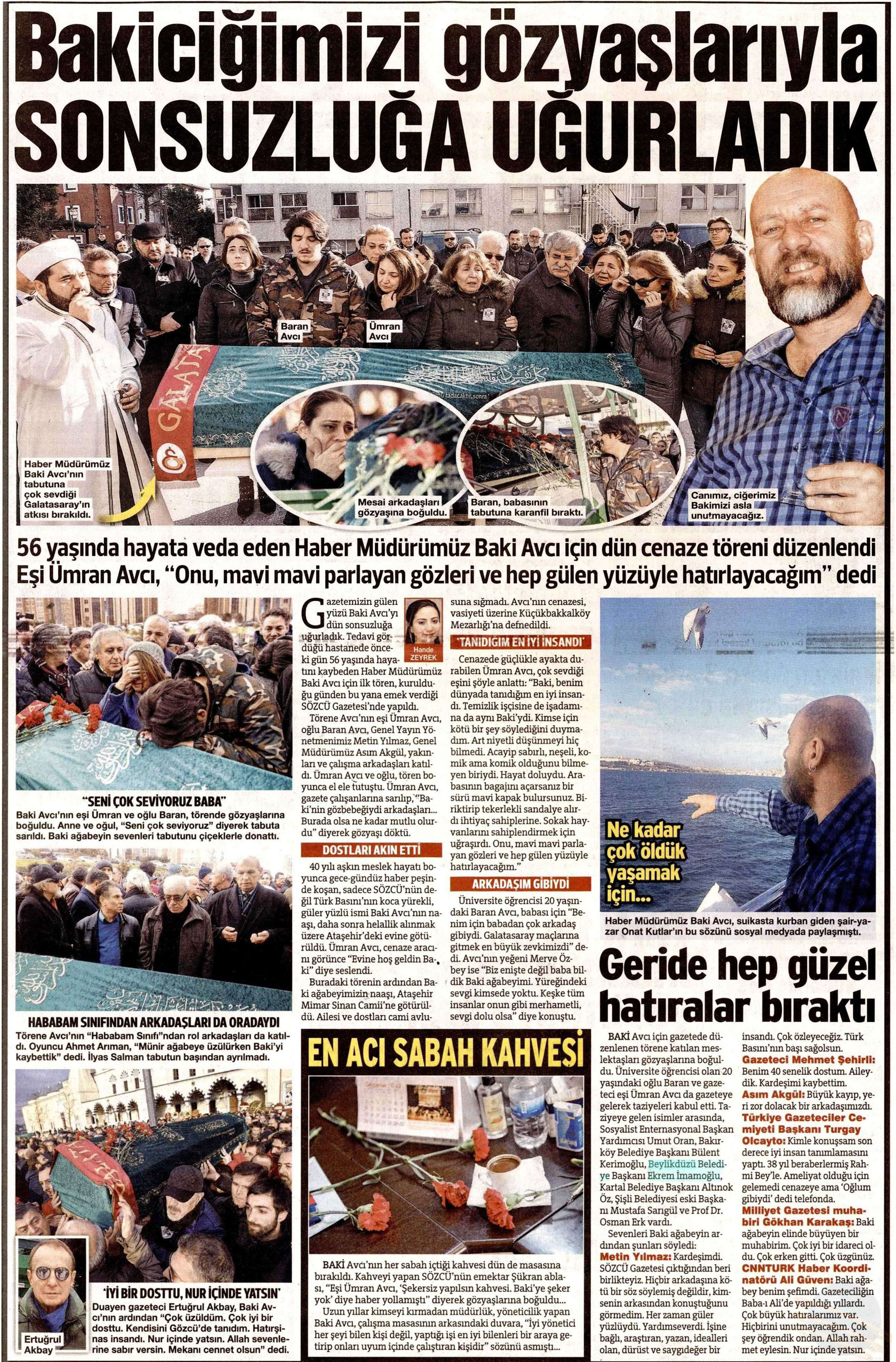 16 Ocak 2018 tarihli "SÖZCÜ" Gazetesi. Sözcü gazetesi Haber Müdürü Baki Avcı sonsuzluğa uğurlandı. 56 yaşında hayatını kaybeden deneyimli haber müdürü Baki Avcı için ilk cenaze töreni meslektaşları tarafından uzun yıllardır emek verdiği Sözcü Gazetesi'nde yapıldı. Avcı'nın cenaze törenine meslektaşları, Sosyalist Enternasyonal Başkan Yardımcısı Umut Oran, Bakırköy Belediye Başkanı Bülent Kerimoğlu, Beylikdüzü Belediye Başkanı Ekrem İmamoğlu, Kartal Belediye Başkanı Altınok Öz, Şişli Belediyesi eski Başkanı Mustafa Sarıgül ve Prof.Dr. Osman Erk Katıldı. Törende, Baki Avcı'nın 20 yaşındaki oğlu Baran Avcı ve gazeteci eşi Ümran Avcı taziyeleri kabul etti.