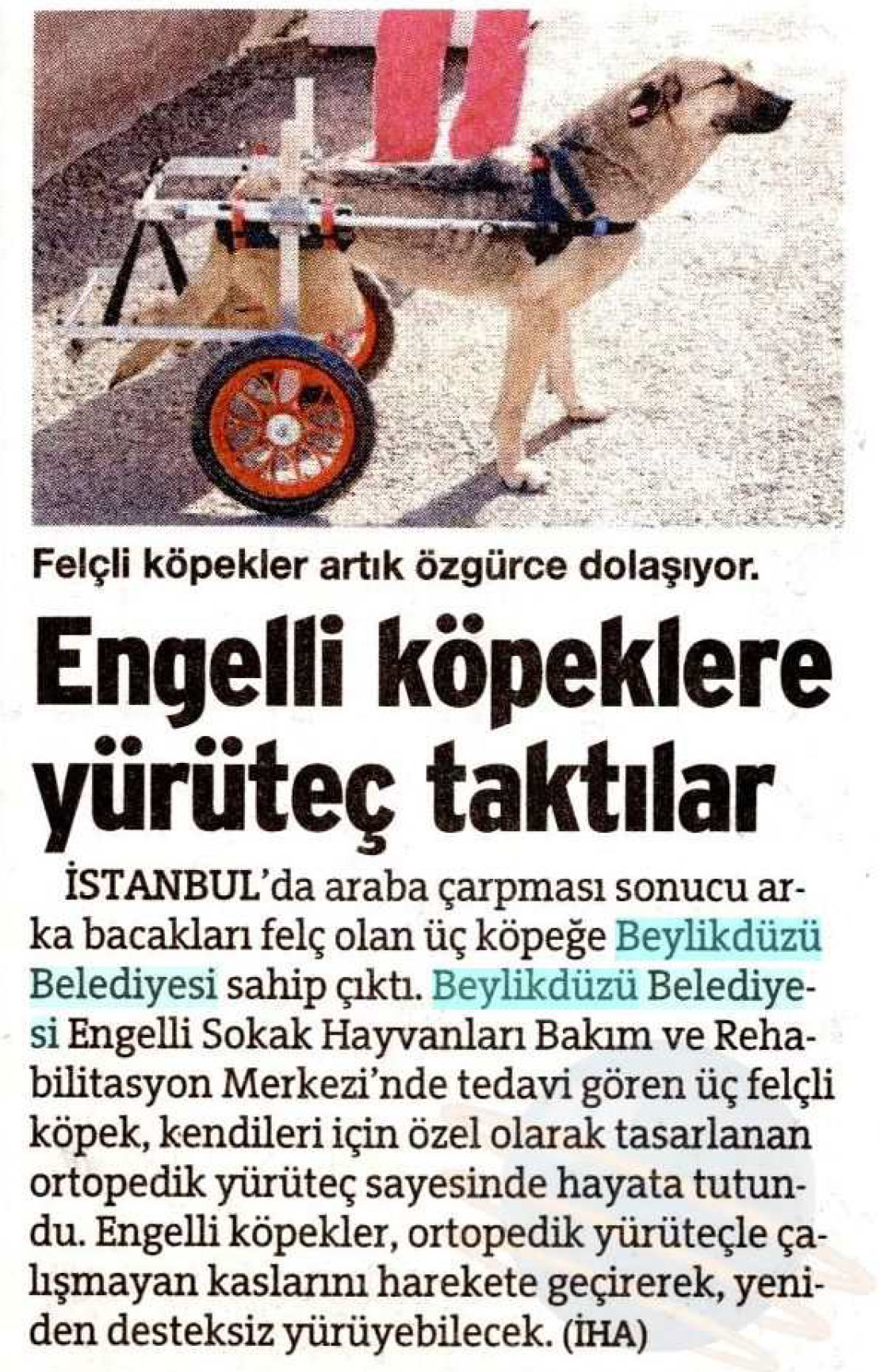 11 Şubat 2018 tarihli "SÖZCÜ" gazetesi. İstanbul'da araç çarpması sonucu arka ayakları felç olan üç köpeğe, Beylikdüzü Belediyesi Engelli Sokak Hayvanları Bakım ve Rehabilitasyon Merkezi tarafından ortopedik yürüteç temin edildi. Ortopedik yürüteçle köpekler yeniden desteksiz yürüyebilecek.