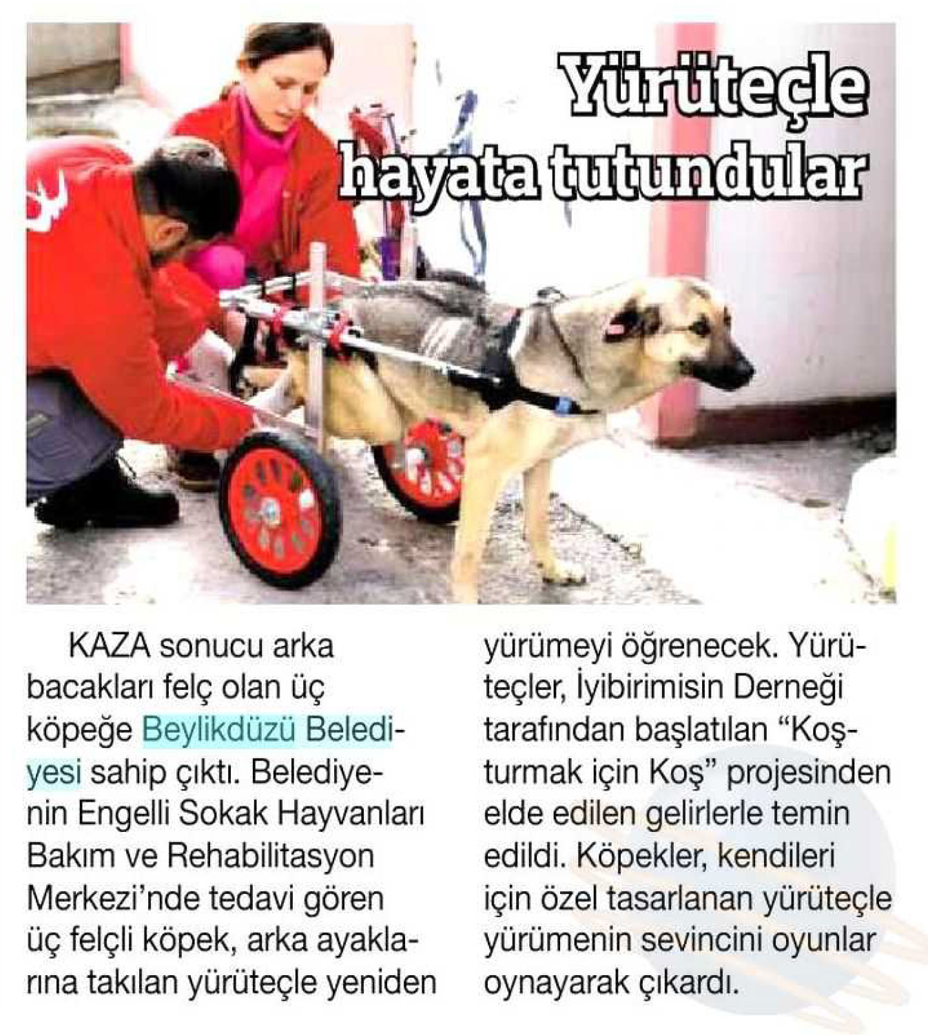 11 Şubat 2018 tarihli "HABERTÜRK" gazetesi. Kaza sonucu arka bacakları felç olan köpeğe Beylikdüzü Belediyesi sahip çıktı. Belediyenin Engelli Sokak Hayvanları Bakım ve Rehabilitasyon Merkezi'nde tedavi gören üç felçli köpek arka ayaklarına takılan yürüteçle yeniden yürümeyi öğrenecek. Yürüteçler, İyibirimisin Derneği tarafından başlatılan "Koşturmak için Koş" projesinden elde edilen gelirlerle temin edildi.