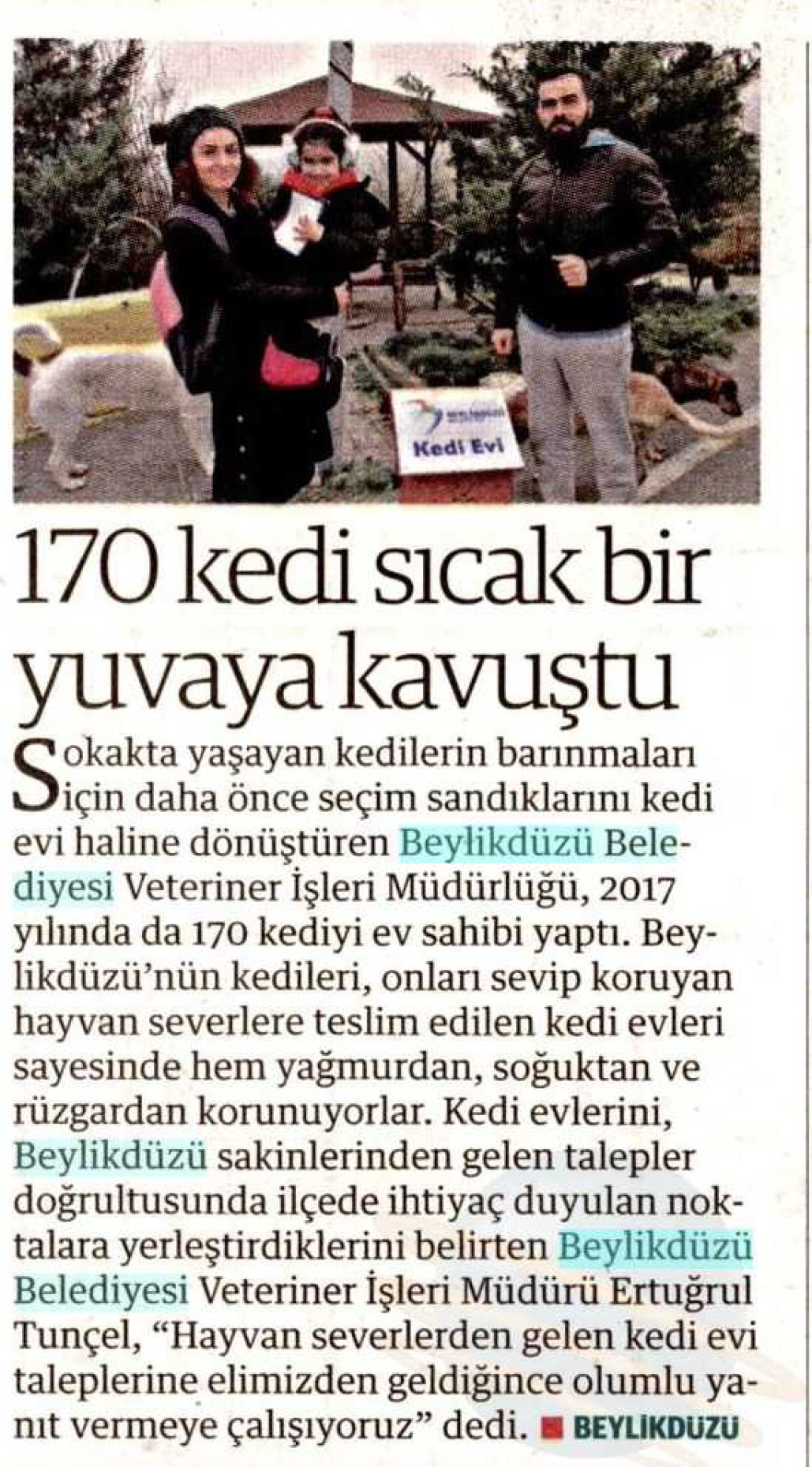 22 Şubat 2018 tarihli "YENİ ŞAFAK" gazetesi. Sokakta yaşayan kedilerin barınmaları için daha önce seçim sandıklarını kedi evi haline dönüştüren Beylikdüzü Belediyesi Veteriner İşleri Müdürlüğü, 2017 yılında da 170 kediyi ev sahibi yaptı. Beylikdüzü Belediyesi Veteriner İşleri Müdürü Ertuğrul Tunçel " Hayvan severlerden gelen kedi evi taleplerine elimizden geldiğince olumlu yanıt vermeye çalışıyoruz" dedi.