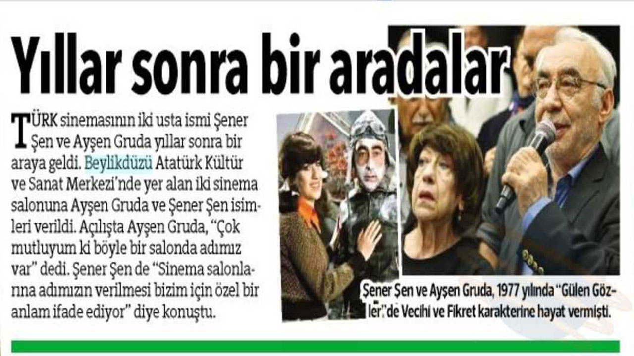 11 Mayıs 2018 tarihli "HÜRRİYET" gazetesi. Türk sinemasının iki usta ismi Şener Şen ve Ayşen Gruda yıllar sonra bir araya geldi. Beylikdüzü Atatürk Kültür ve Sanat Merkezi'nde yer alan iki sinema salonuna Ayşen Gruda ve Şener Şen isimleri verildi.