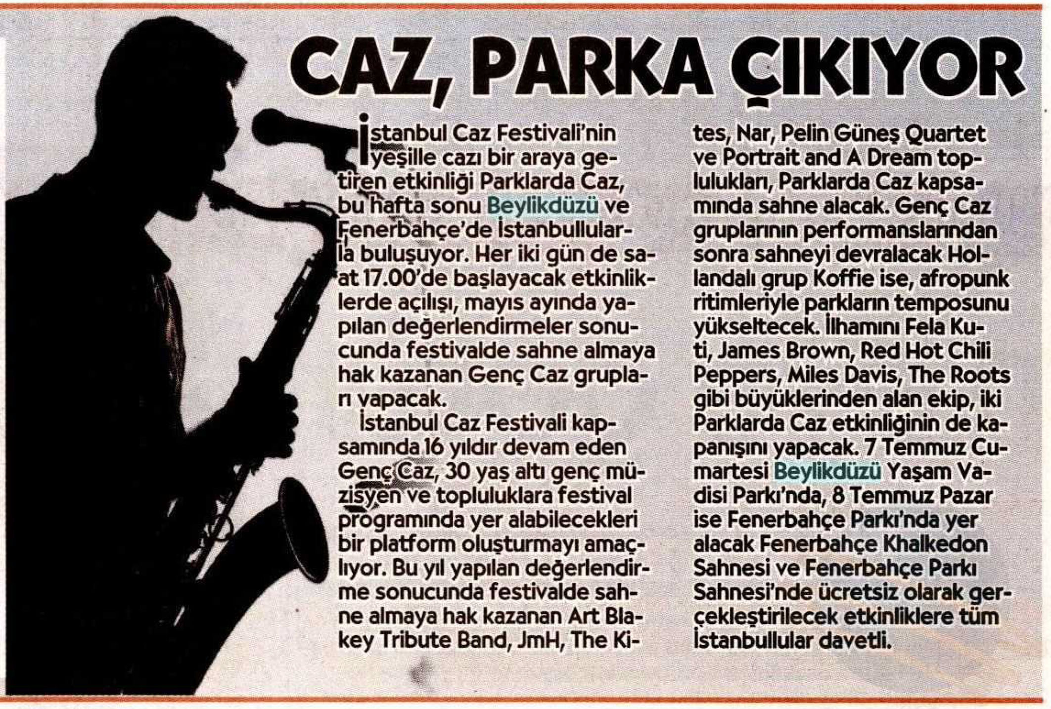 6 Temmuz 2018 tarihli "CUMHURİYET" gazetesi. İstanbul Caz Festivali'nin yeşille cazı bir araya getiren etkinliği Parklarda Caz, bu hafta sonu Beylikdüzü ve Fenerbahçe'de İstanbullularla buluşuyor. 7 Temmuz Cumartesi Beylikdüzü Yaşam Vadisi Parkı'nda, 8 Temmuz Pazar ise Fenerbahçe Parkı'nda yer alacak Fenerbahçe Khalkedon Sahnesi ve Fenerbahçe Parkı Sahnesi'nde ücretsiz olarak gerçekleştirilecek etkinliklere tüm İstanbullular davetli