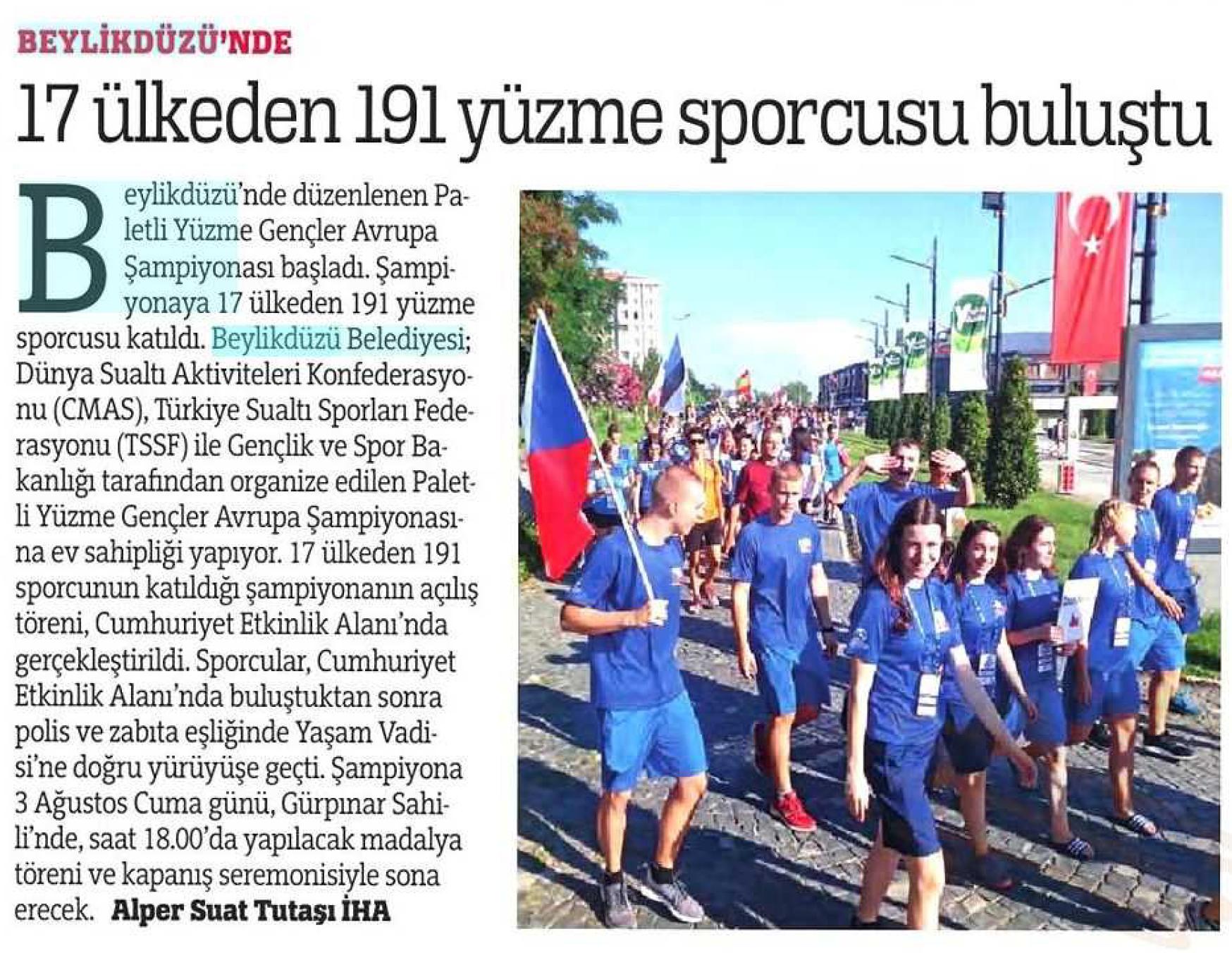 31 Temmuz tarihli "TÜRKİYE" gazetesi. Beylikdüzü'nde düzenlenen paletle Yüzme Gençler Avrupa Şampiyonası başladı. Şampiyonaya 17 ülkeden 191 yüzme sporcusu katıldı.