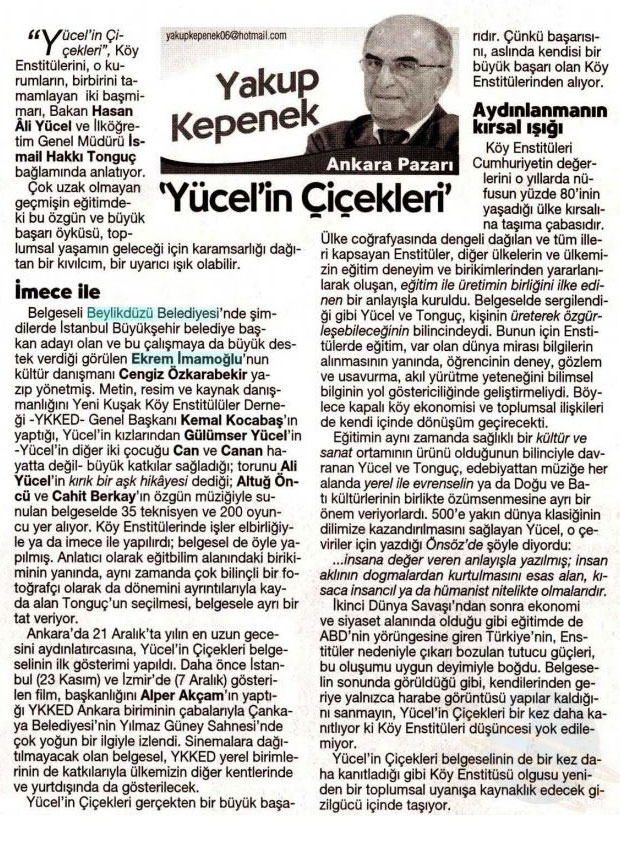 24 Aralık 2018 tarihli "CUMHURİYET" gazetesi. Cumhuriyet gazetesi köşe yazarı Yakup Kepenek; Milli Eğitim Bakanı Hasan Ali Yücel ve İlköğretim Genel Müdürü İsmail Hakkı Tonguç'un hayat hikayeleri üzerinden Köy Enstitülerini anlatan "Yücel'in Çiçekleri" adlı belgesel film hakkında yazdığı köşe yazısı.