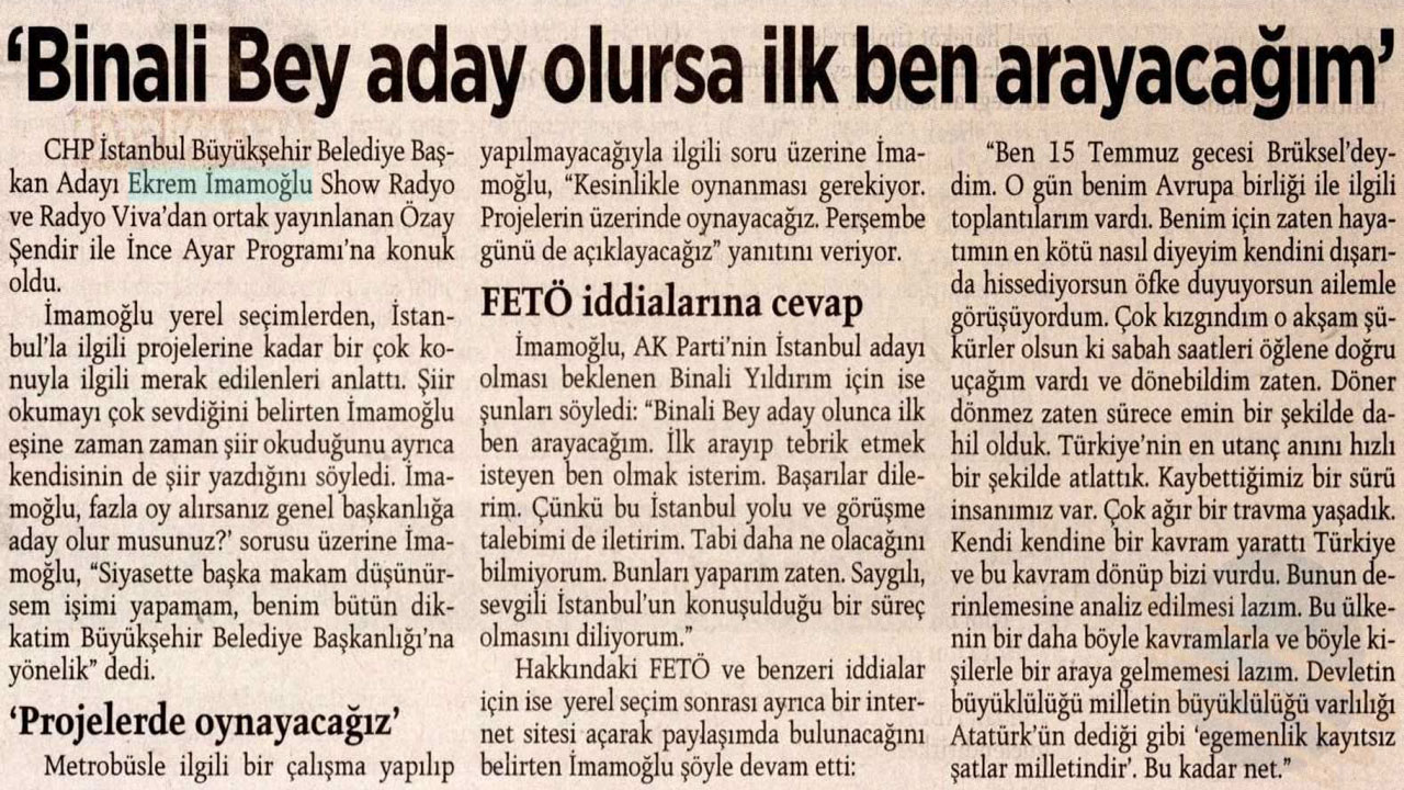 26 aralık 2018 tarihli "MİLLİYET" gazetesi. CHP İstanbul Büyükşehir Belediye Başkan Adayı Ekrem İmamoğlu Show Radyo ve Radyo Viva'dan ortak yayınlanan Özay Şendir ile İnce Ayar Programı'na konuk oldu. İmamoğlu yerel seçimlerden, İstanbul'a, ilgili projelerine kadar bir çok konuyla ilgili merak edilenleri anlattı.